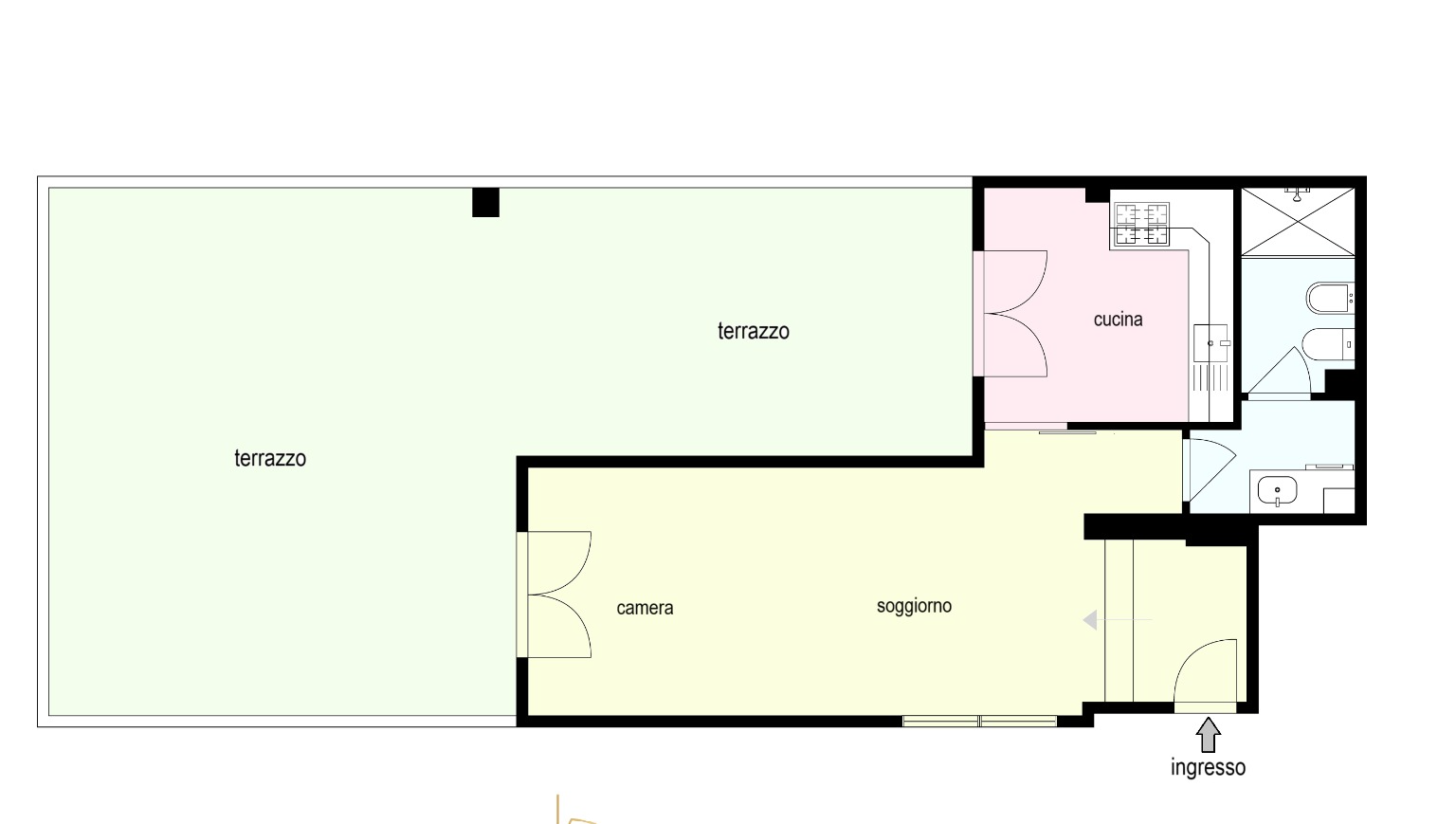 Distribuzione degli spazi: ingresso, zona living con camera, cucina separata, bagno con area lavanderia. Il vero punto di forza dell’immobile è l’ampio terrazzo, una rarità nella zona, ideale per vivere l’esterno in piena privacy, perfetto per momenti di relax o per ospitare amici.